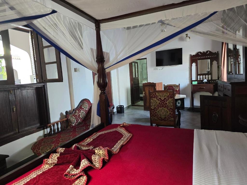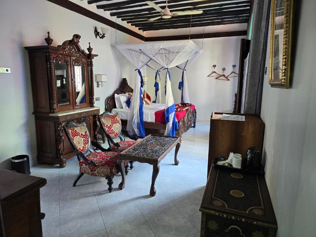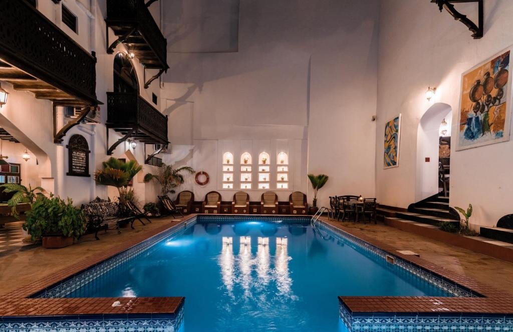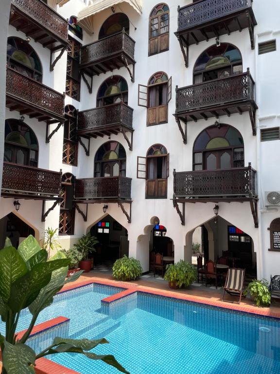 Dhow Palace is a beautifully restored heritage hotel in the heart of Stone Town, showcasing classic Swahili and Zanzibari décor with carved furniture and antique ornaments. It features 30 air-conditioned rooms with en-suite bathrooms, traditional beds, modern amenities, and many with balconies overlooking the courtyard or pool. Guests enjoy an internal swimming pool, rooftop restaurant with sunset views, and a mix of local and international cuisine. The hotel provides WiFi, safety-deposit boxes, laundry service, and friendly staff. With included breakfast and family-friendly policies, its central location makes it an ideal base for exploring Stone Town.